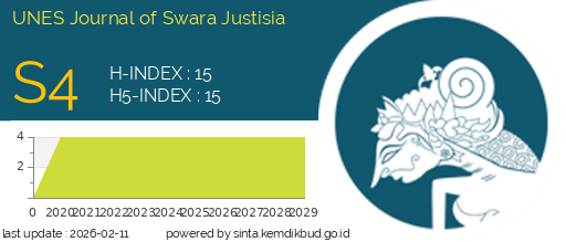 - Penulis mengakui bahwa UNES Journal of Swara Justisia (UJSJ) berhak menjadi yang pertama menerbitkan dengan lisensi Creative Commons Attribution 4.0 International (Attribution 4.0 International CC BY 4.0).